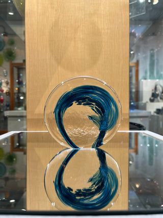 Our custom glass awards are perfect for any occasion. Each piece is blown individually, and we can create all sorts of custom shapes and sizes to best fit your ceremony. Glass awards are very visually striking and are definitely NOT your average trophy! We can style awards that can bring your brand to life through colors of your choice! Our wave awards are an example of awards we could provide you with if you are looking for more of an organic shaped award rather than a corporate style award. We also can create custom marbles for your company. Please contact us to create a memorable gift that your staff will be proud to display. Featuring a sparkling dichroic image with your company's logo on a cobalt blue background. Custom orders require a 50% nonrefundable deposit. To learn more or inquire about other custom orders, contact us here. We look forward to working with you!